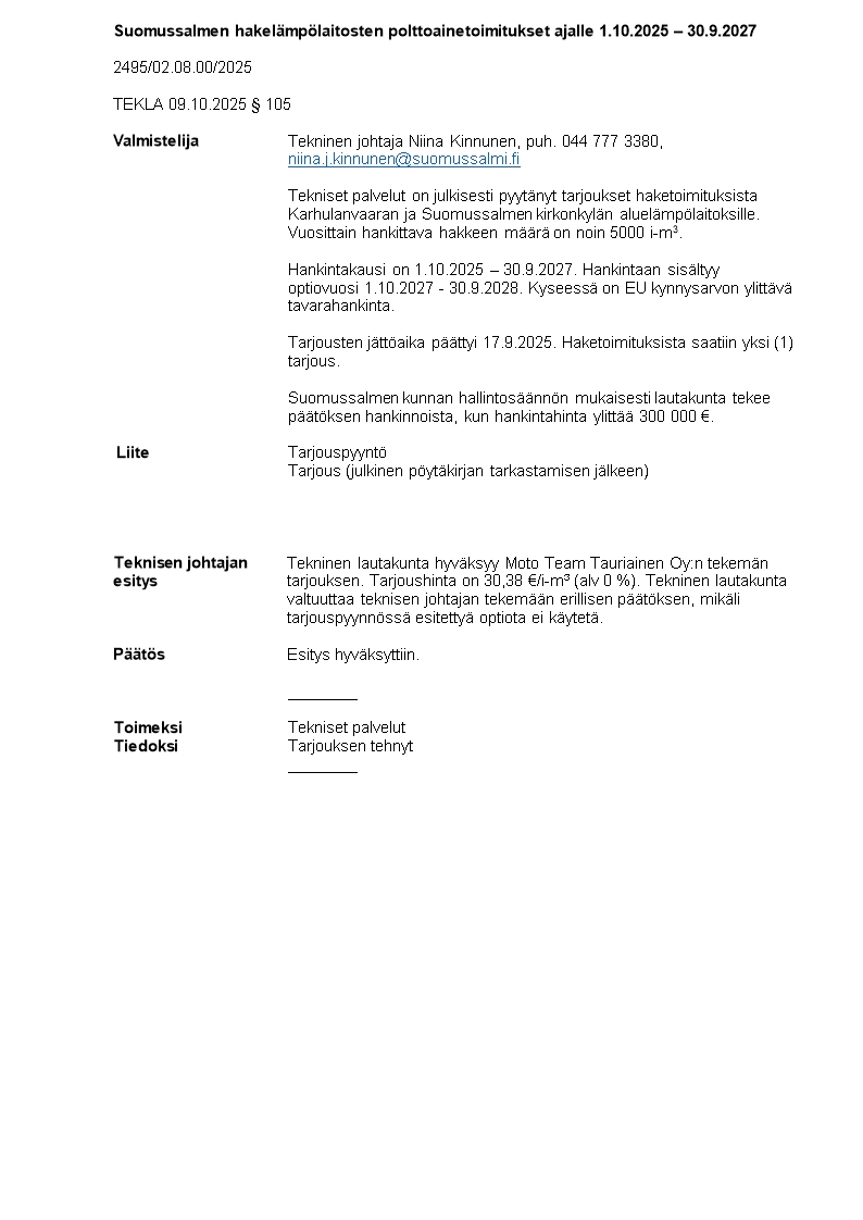 Pöytäkirja 09.10.2025/Pykälä 105