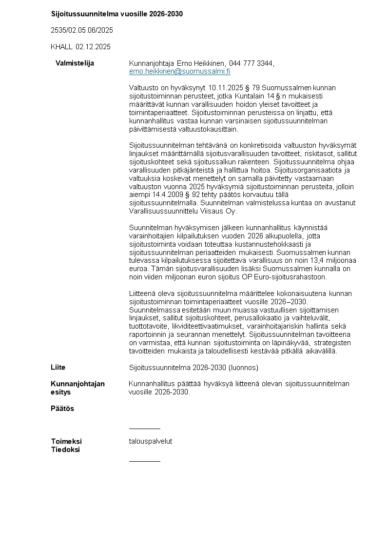 Liite 1  Sijoitussuunnitelma 2026-2030_luonnos