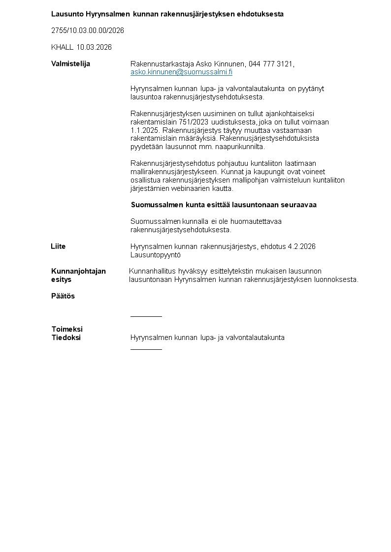 | Liite 6 | Hyrynsalmen kunnan lausuntopyynnön rakennusjärjestyksen ehdotus 4.2.2026 | |